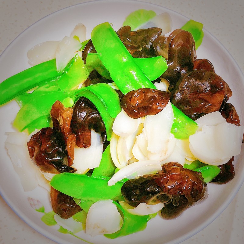 泡发木耳适量;弯豆适量;鲜百合2个;