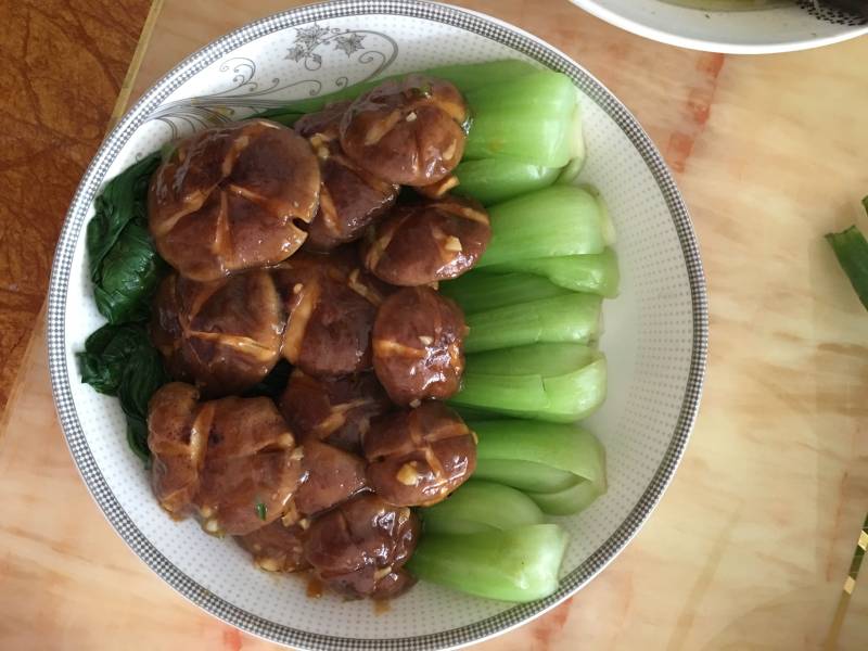 1:油菜取根部5cm处切段,用小刀把每片叶片修成花瓣形焯水待用,香菇去根部片大片焯水