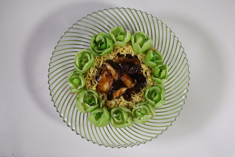 11:莲花菜根摆在周围,炒好的香菇油菜摆放中间