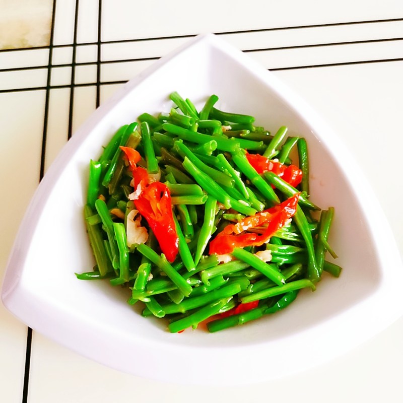 4:油七成热时,下入空心菜梗、大蒜头、辣椒,翻炒断生。