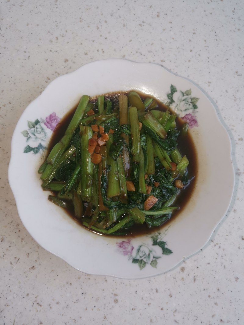 3:放菜心,大火煸炒出锅前放盐调味即可。