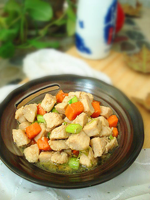 5:炒锅倒油,放入葱末,姜末炒出香味后放入胡萝卜丁和芹菜丁略炒,再放入鸡丁。