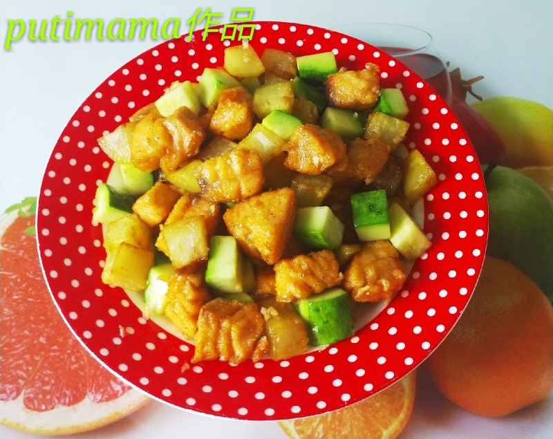 5:加入杏鲍菇丁,继续翻炒,杏鲍菇和豆薯水分比较多,开大火炒,会减少水分