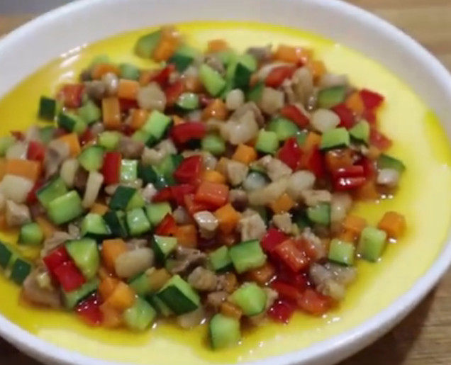 8:豆腐蛋羹蒸好取出,加入炒好的时蔬肉丁即可。