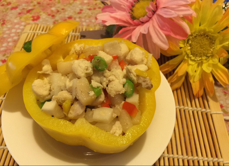 11:装进彩椒里,完成营养健康的鲜蔬鸡丁红豆饭