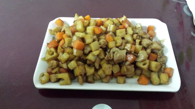 4:待鸡肉炒到变色,依次放入藕丁,胡萝卜丁,继续翻炒,快熟的时候放点醋,味大美酱油,我放的酱多,就没在放盐。