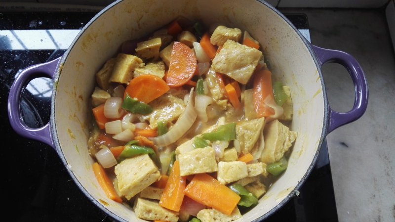 9:下了咖喱之后,我把火调到中小火,慢慢收味,盖上盖,一分钟