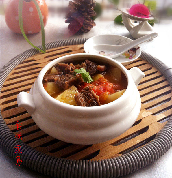 9:一个半小时后,再放入土豆,炖半小时,这是牛腩已经炖烂了,番茄也炖的只剩下皮了,土豆因为比较容易炖,所以要后半小时放。