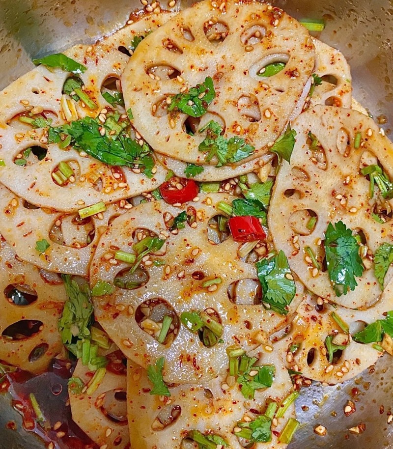 3:把料汁倒在藕片上加入香菜拌匀就可以吃啦!