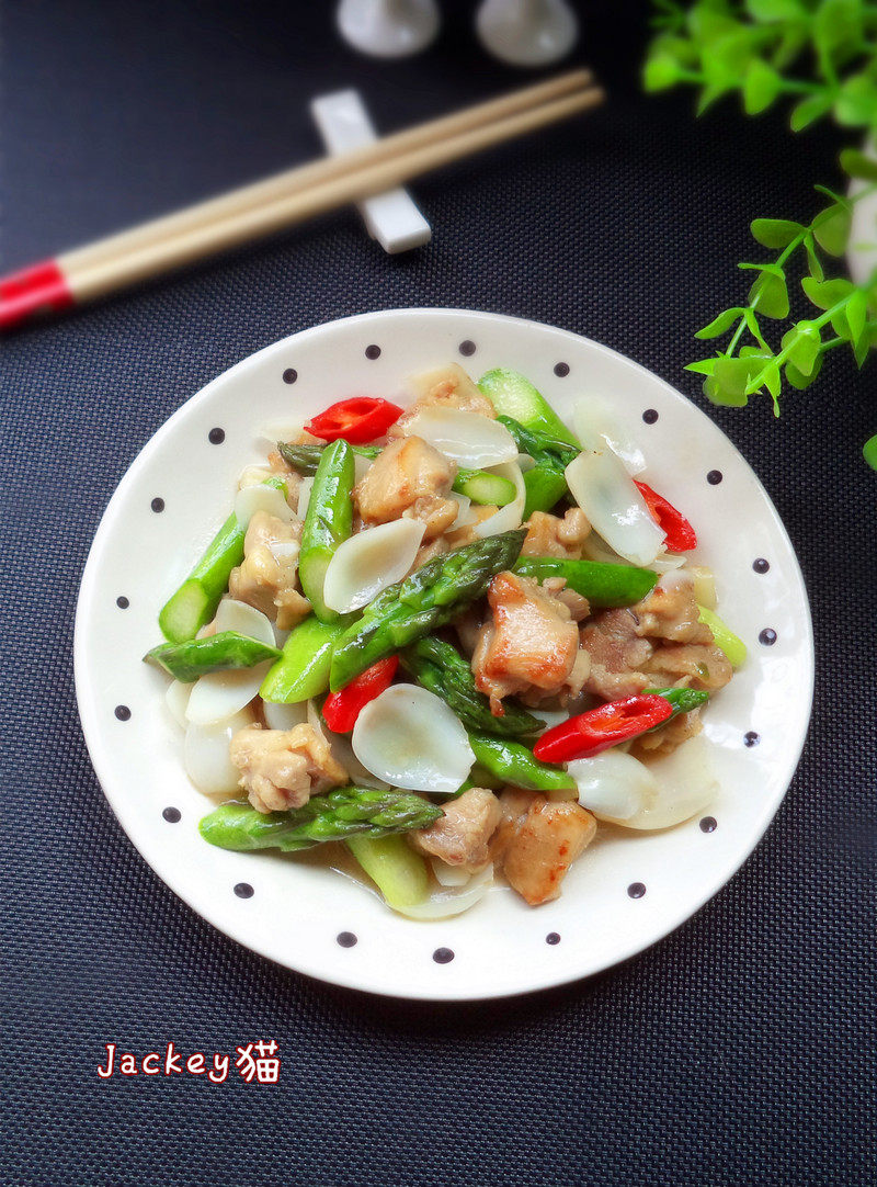 芦笋250克;百合100克;鸡腿2只;姜蒜15克;红椒1根;