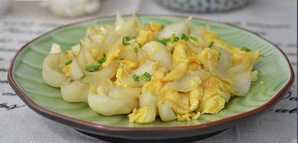 2:炒锅放极少量油,热至四五成时倒入蛋液,炒熟,分切成大块,铲出备用。另起锅,爆葱和姜。加入百合翻炒两分钟。倒入之前炒好的鸡蛋。