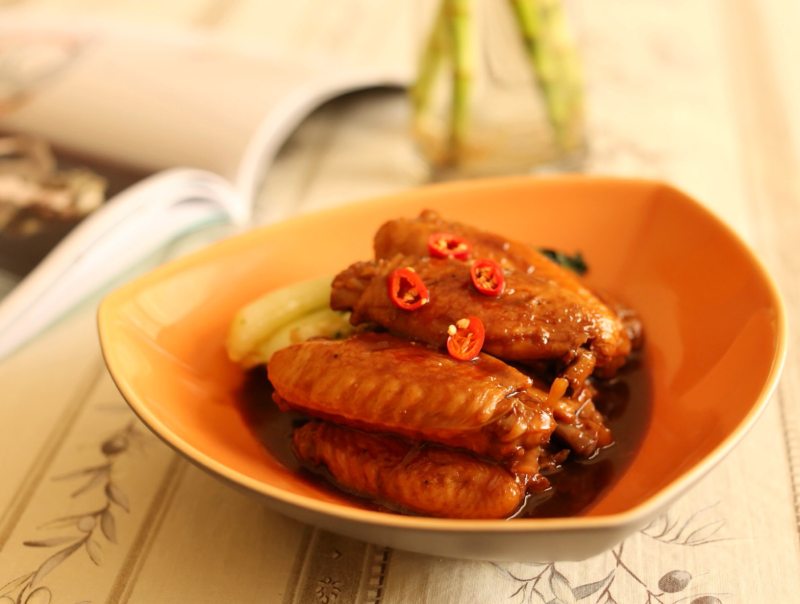 7:烧制到鸡翅熟透,鸡汁黏稠,将鸡翅盛出。