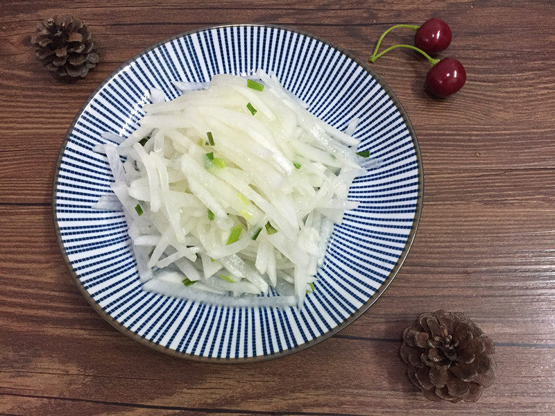 2:将白萝卜清洗干净后削去外皮,然后用刀切成细丝。