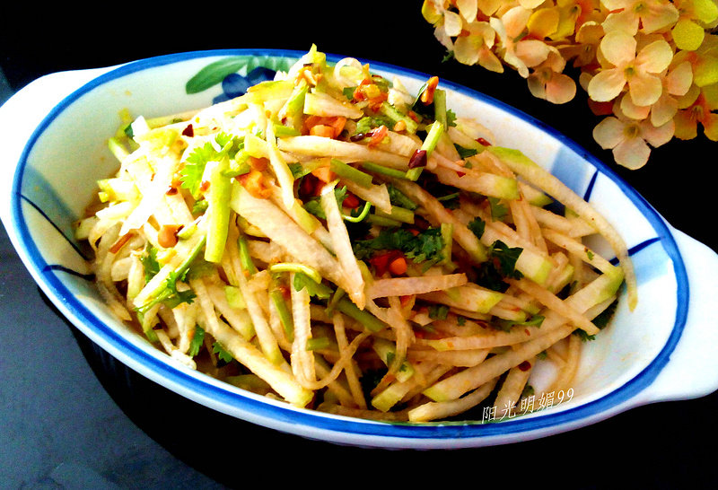 2:切丝放入盆中,加盐,糖,腌制出水后倒掉,放入香油和香菜,拌匀即可。