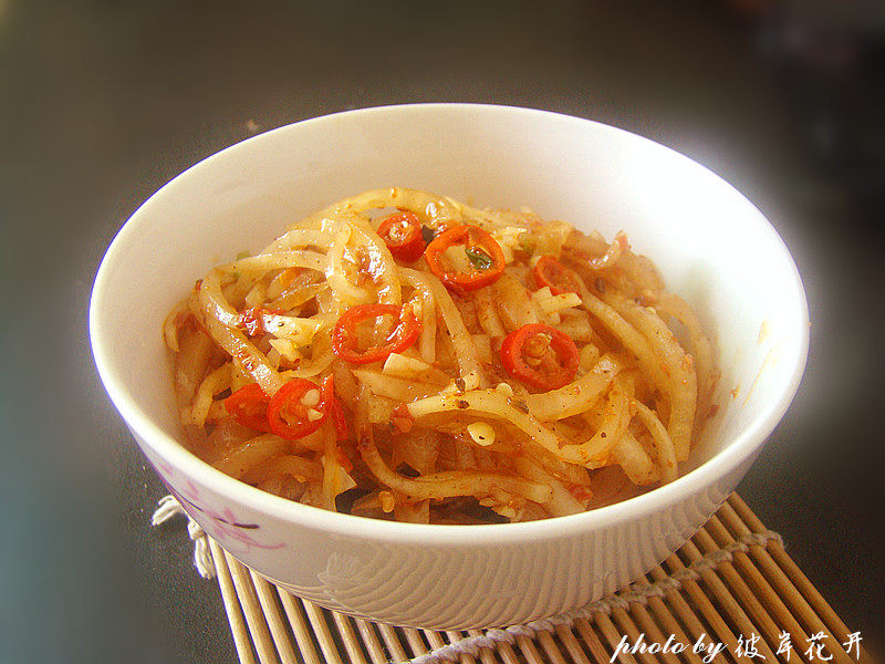 2:白萝卜表皮用盐搓洗,清水洗净,控干水分,切成细丝,放入蒜末、小米椒、盐、白糖、生抽、陈醋、辣椒面、花椒面、葱末(这些调料依据自己的口味放),最后锅内入油烧热淋在上面,把葱花和辣椒面爆香。
