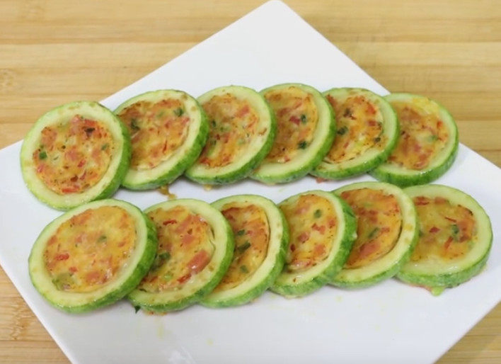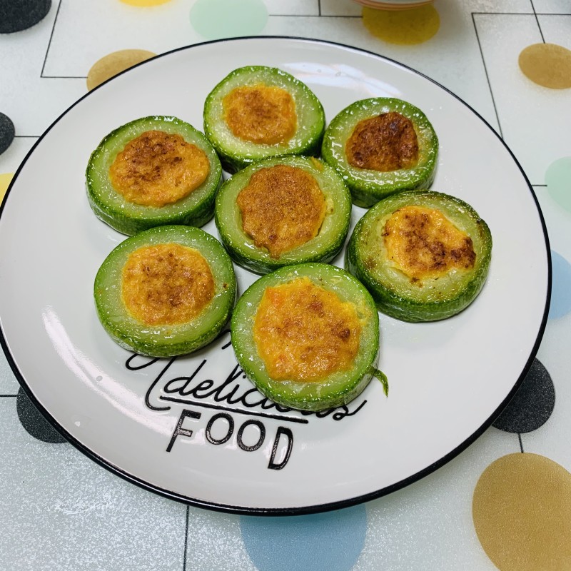 5:西葫芦冷油下锅,把拌好的馅料舀进去压实,开小火慢煎。