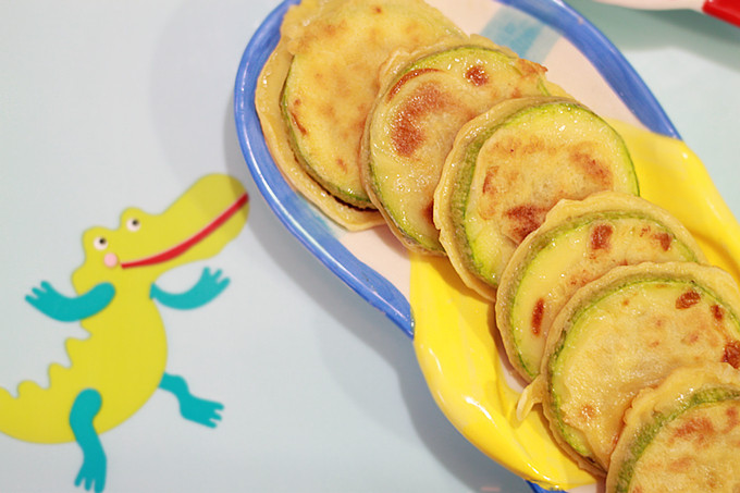 4:平底锅抹油,然后将西葫芦一片片放入面糊里沾一下;