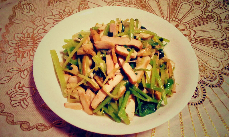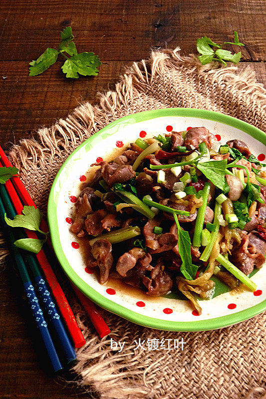 3:再放入香芹炒两分钟,调入香油.鸡精.盐就可装盘啦!