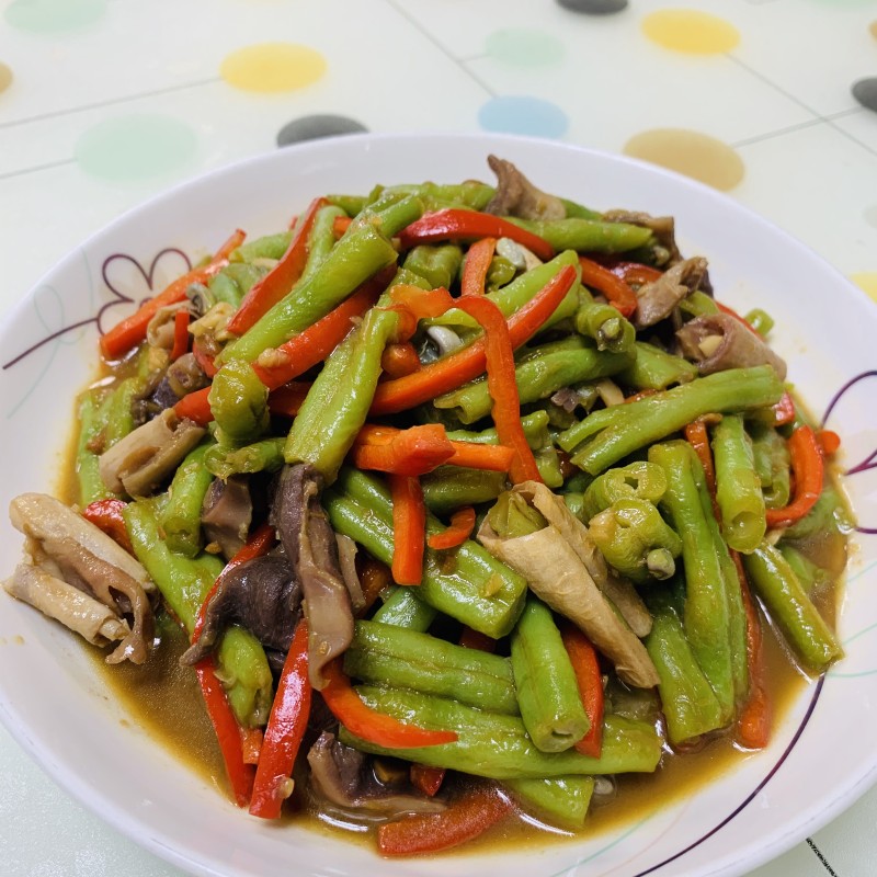 9:开盖,尖椒丝倒进去翻炒一分钟。根据口味决定是否加盐。我觉得黄豆酱够味了,没加盐。