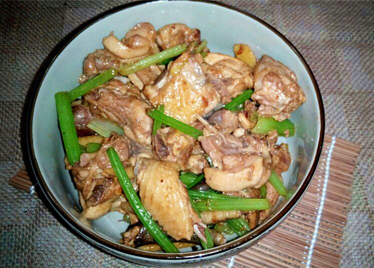 3:鸡炒至七分熟时加香芹,放盐,继续爆炒至鸡全熟即可上碟。