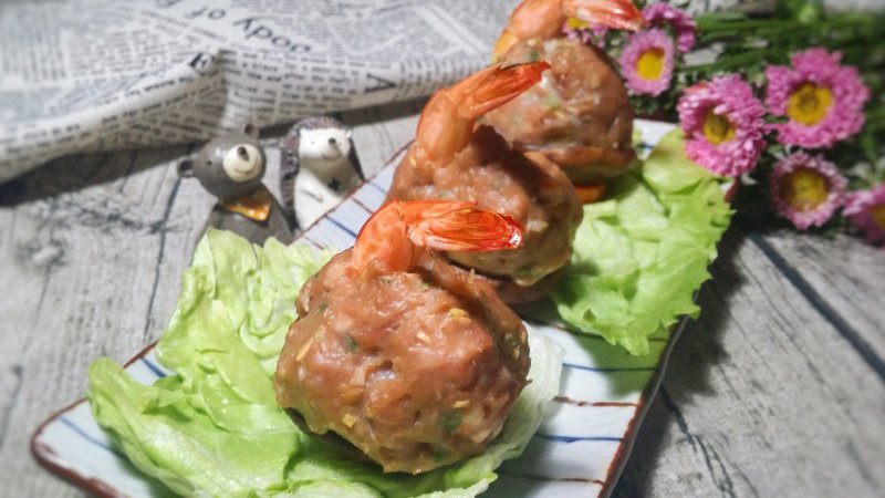 瘦肉馅250克;香菇9个;大虾9个;姜末适量;葱末适量;胡萝卜片9片;