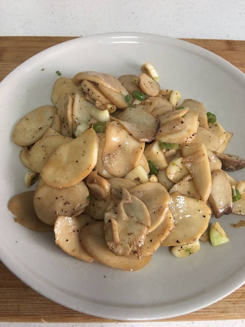 1:葱蒜切碎,杏鲍菇切片焯熟。