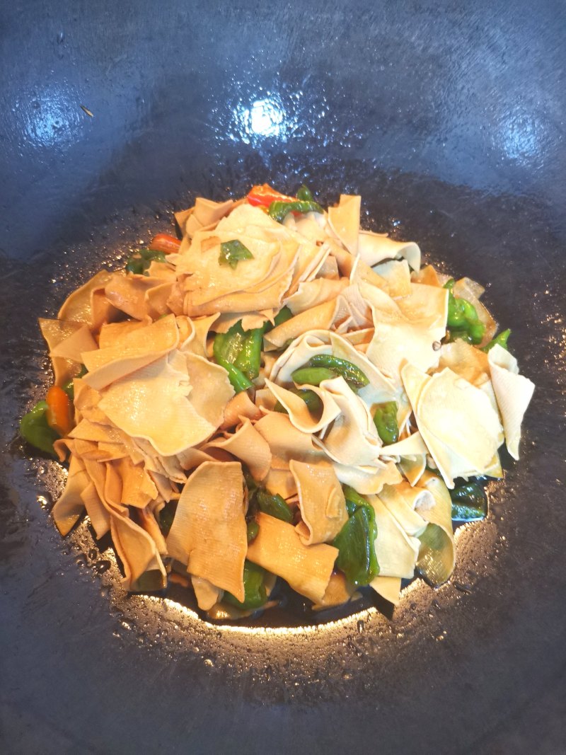 5:放入焯好水的豆腐皮,煸炒一分钟,烹入生抽,料酒,白糖,蚝油炒匀即可。