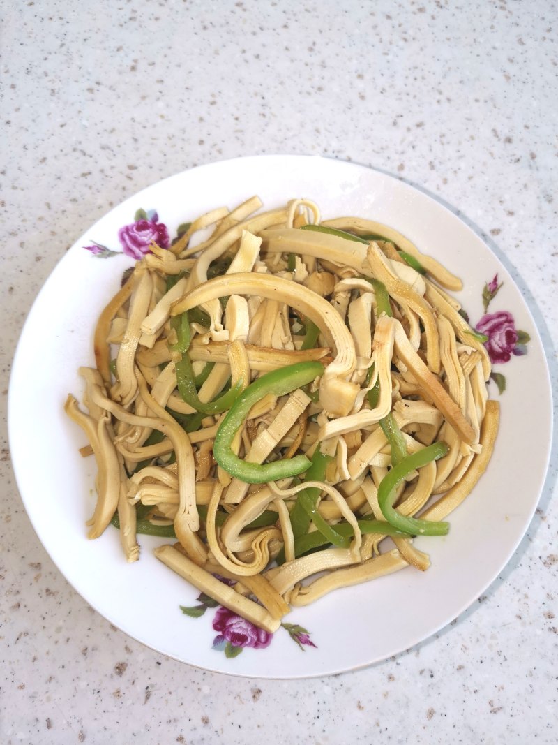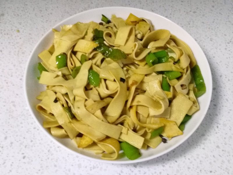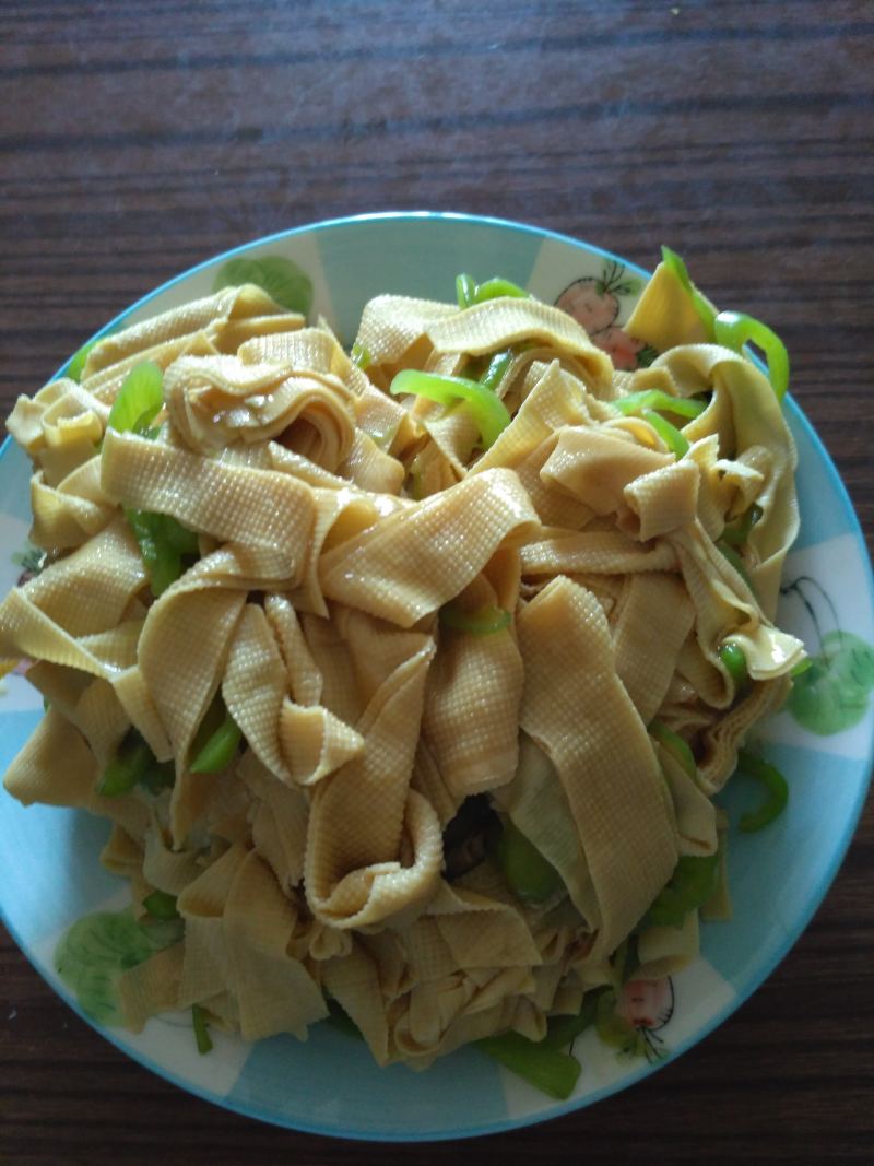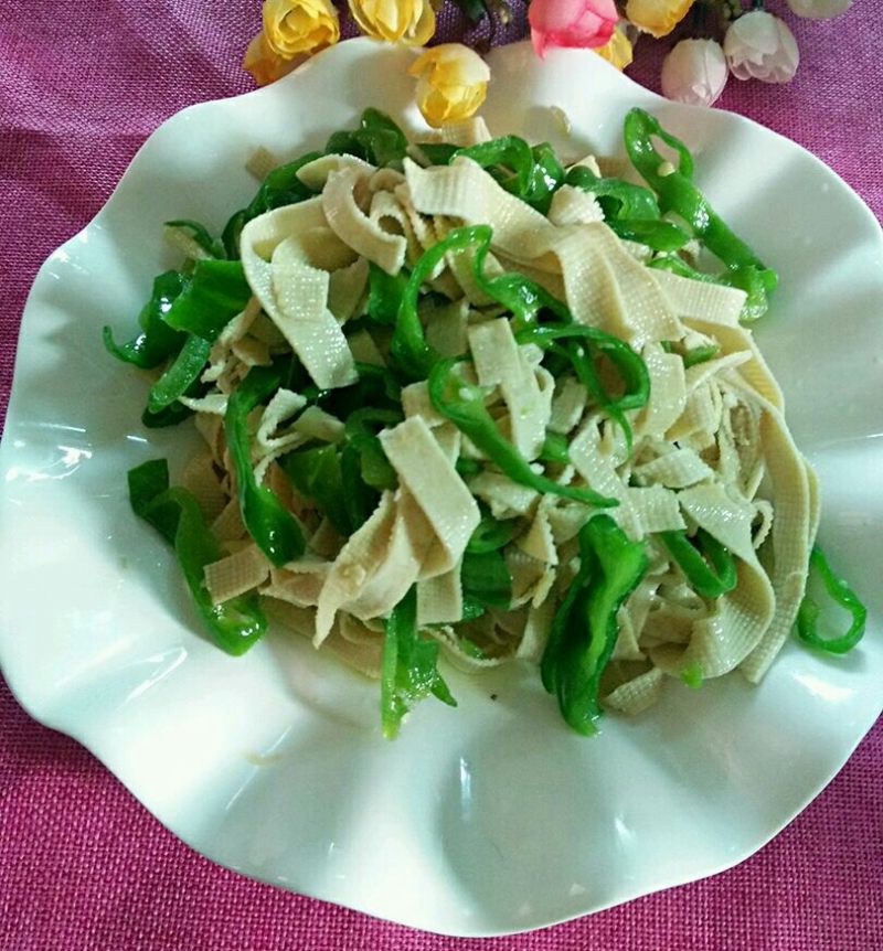 2:青椒洗净去蒂切成丝豆腐皮切成丝放水中泡洗干净干净。