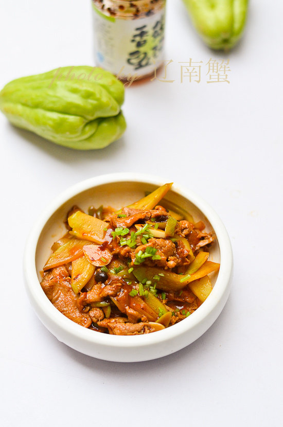 2:佛手瓜切成片,辣椒切成丝,葱切成葱花
