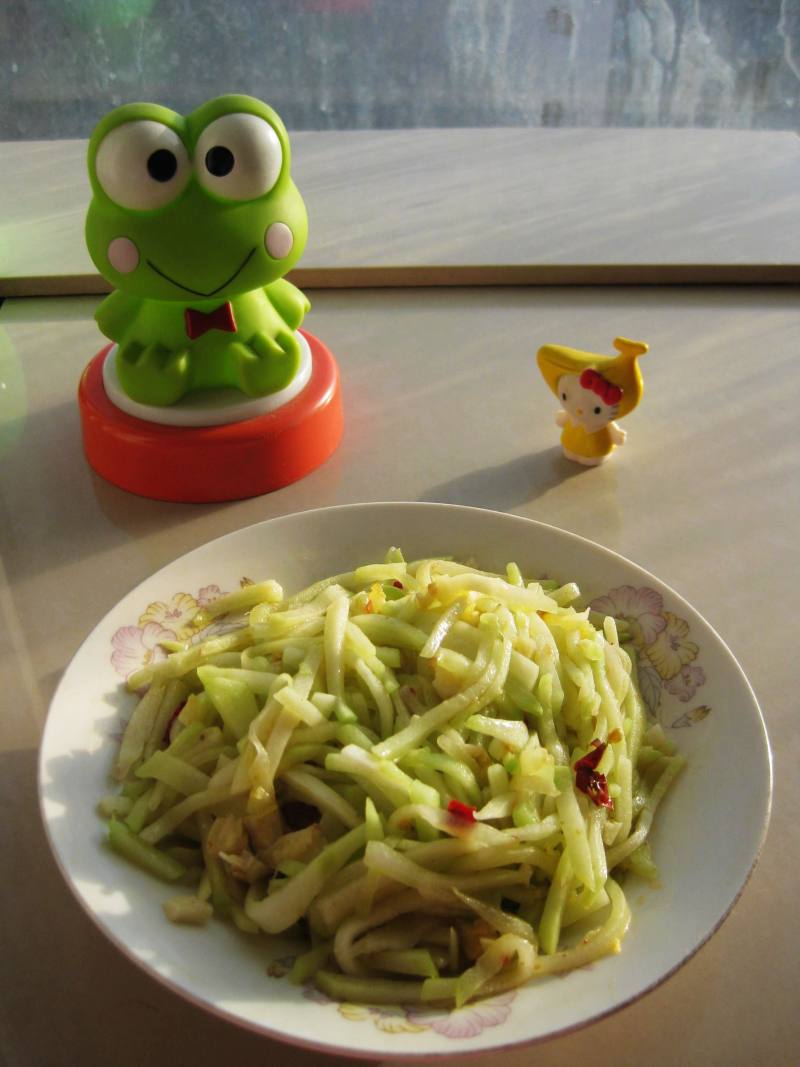 3:佛手瓜切丝,水里漂洗,沥干备用。