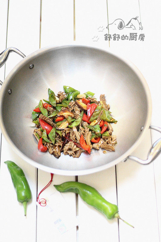 7:然后,合入切好的青椒和盘菜翻炒翻炒。