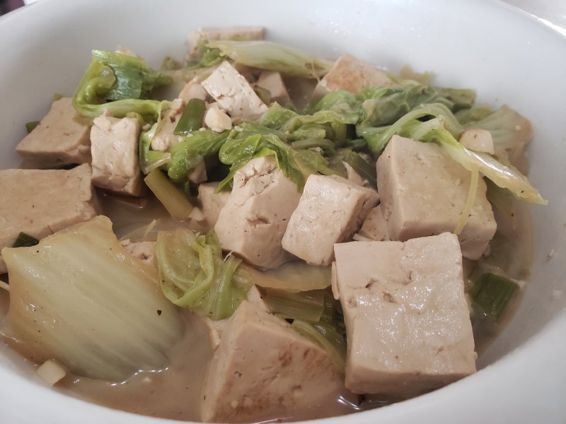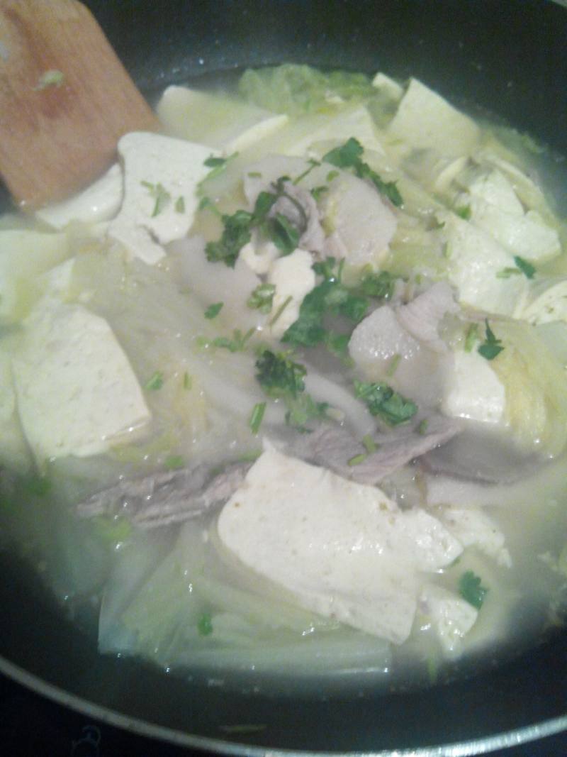 2:锅内倒油烧热,葱花,白菜倒入锅内,将白菜炒倒,加水,放豆腐,肉片,盐,五香粉,大火烧开,咕嘟几分钟。喜欢喝汤可以多加水,不喝汤则少放水