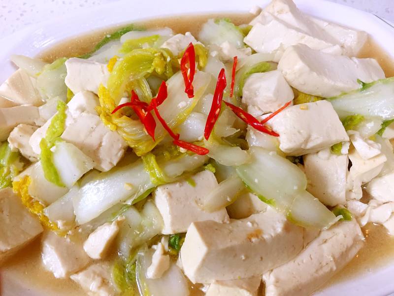 3:热锅凉油,葱姜末爆香,煸炒猪肉末再下入焯好的白菜,最上面将焯水后的豆腐均匀摊铺在白菜上面。出锅前撒入鸡精翻炒几下即可。