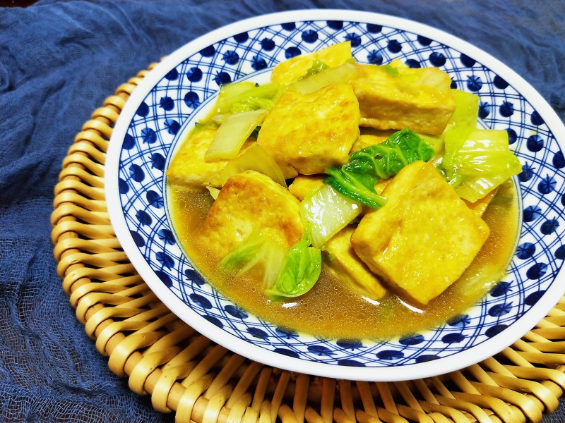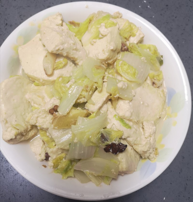 3:放白菜豆腐,简单翻炒两下,一定注意沿锅边翻炒,尽量不要让豆腐打散。