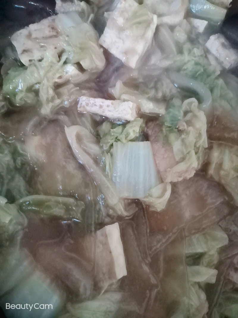 7:加入水,莫过白菜就行,宽粉豆腐一块炖。