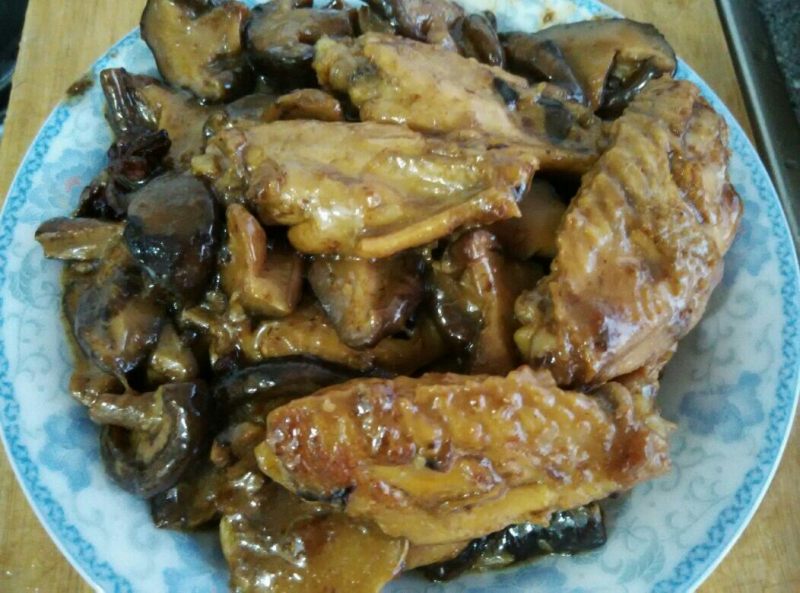 7:倒入开水,没过鸡翅。然后放入备好的香菇。盖锅盖焖煮,直至鸡翅软烂。