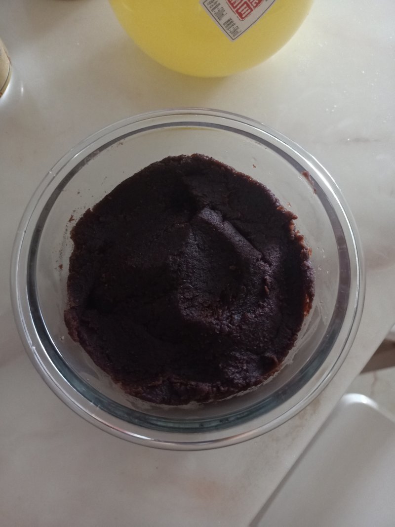 6:加入红豆沙里,在不粘锅里炒至水分干至自己需要的程度即可。