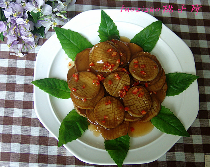 9:将芡汁淋在盘中的杏鲍菇上,撒上红椒粒即可。