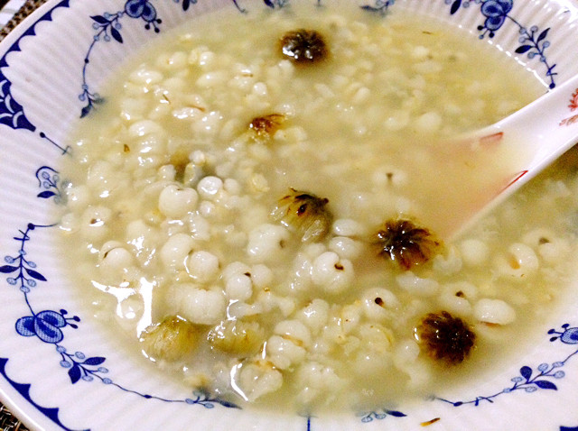 糙米50克;薏米50克;冰糖10克;干菊花2克;