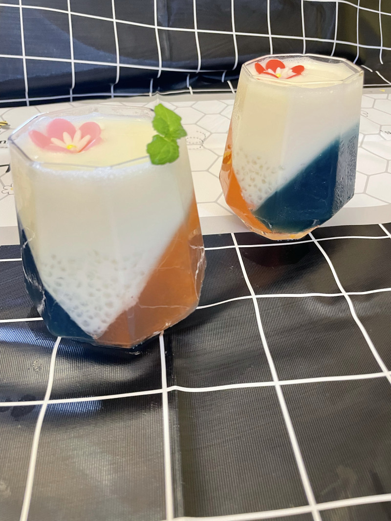 5:再换一个方向倾斜着倒入蓝莓味糖水继续放入冰箱冷藏到完全凝固。
