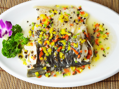 4:将淹制好的鱼肉放入葱姜黄酒鸡精糖油待水烧开蒸10分钟.将鱼身上的葱姜汤汁拿出