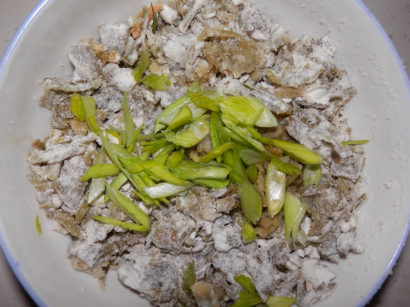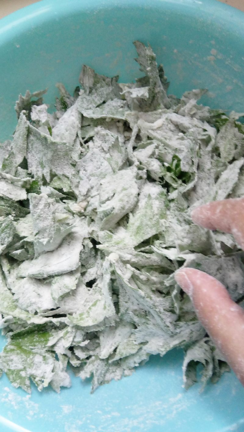 3:面粉可以少量多次加入,边加边搅拌,直到芹菜叶上全都裹上了面粉。