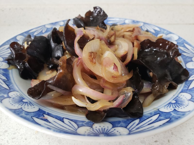 4:锅烧热放少许油,倒入洋葱炒香,再倒入木耳和卤肉加盐和生抽调味,翻炒几下即可。