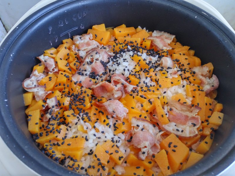6:米淘洗干净,按刻度加入适量的水,再将炒好的南瓜倒入,表面放入芝士即可。