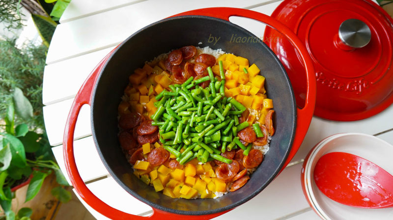8:约需要继续焖10分钟左右,这个过程不需要打开锅盖,注意用小火即可。饭焖好之后放上豆角碎,再淋上之前兑好的料汁,香喷喷的南瓜甜肠焖饭就做好了。