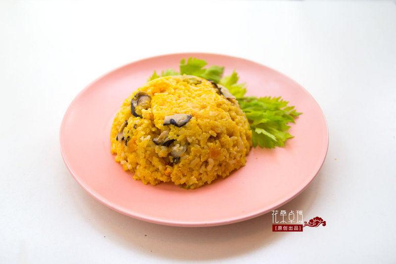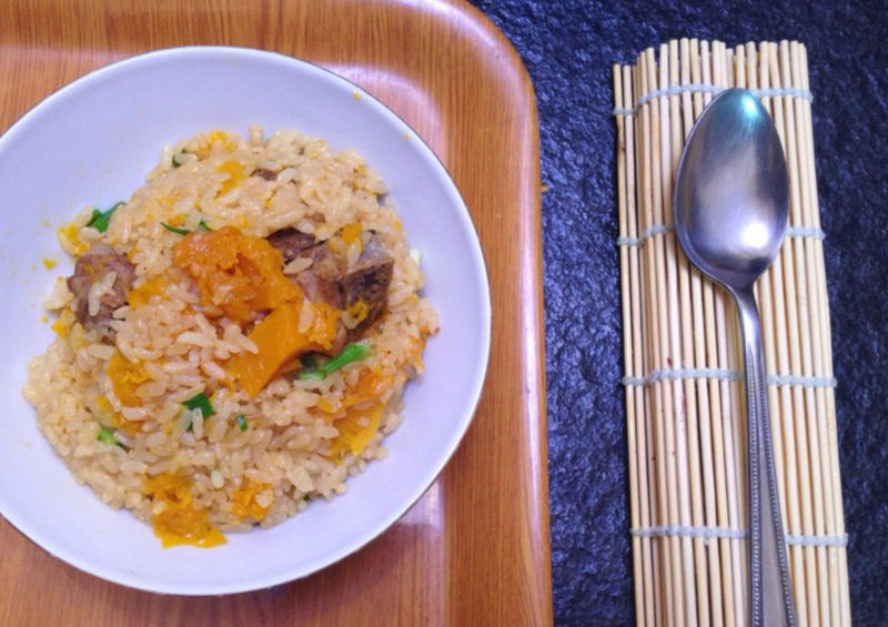 油粘米200克;五花肉70克;南瓜120克;香菇3朵;鱿鱼干半条;