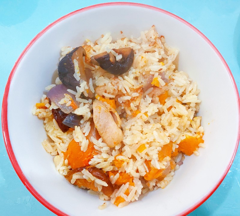 6:煮饭键跳了,南瓜鸡腿焖饭也好了,赶紧乘一碗吃!