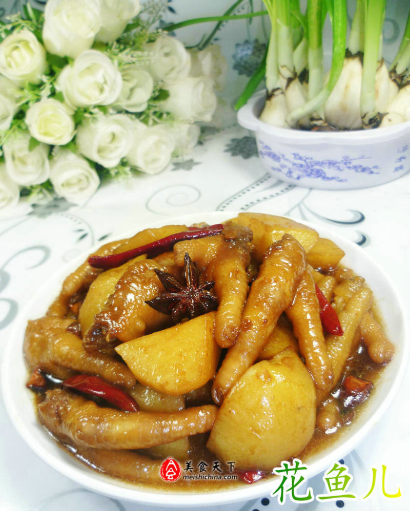 1:材料:土豆(已洗净去皮)、鸡爪(已焯水)、干辣椒、大料