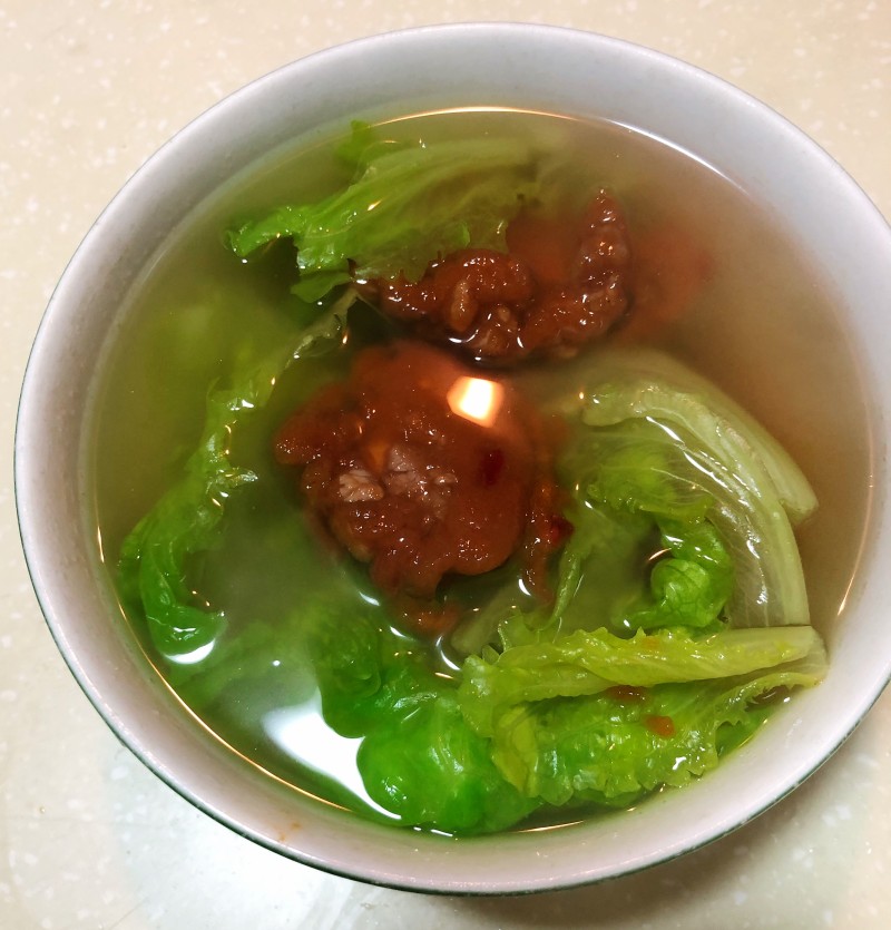 4:肉丸子煮熟浮起来以后,放入切好的生菜叶。