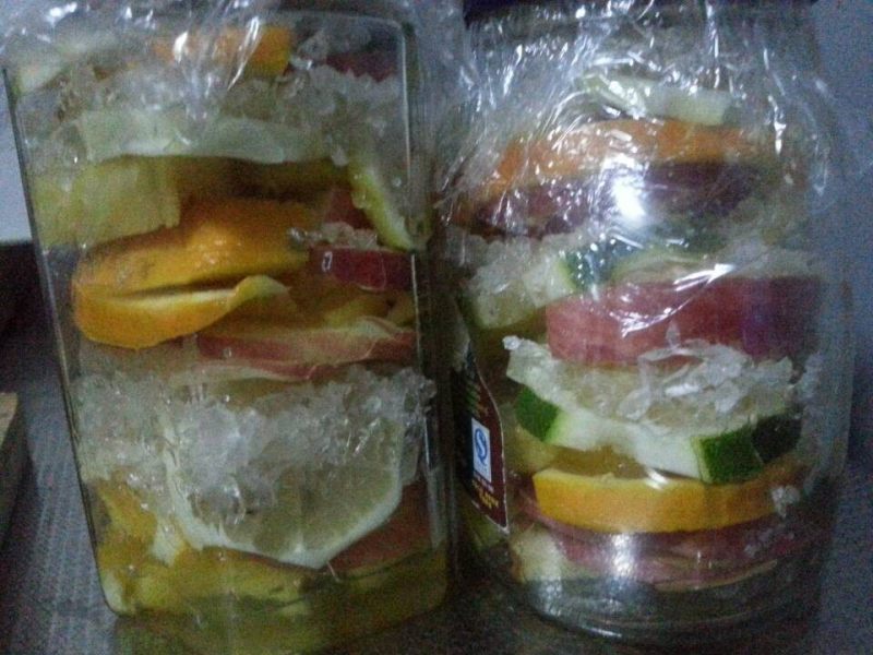 3:把切好的水果,每种都码放一层后在上面放一层柠檬,柠檬我用了两周,黄色的去皮了,因为我买的黄色柠檬皮比较苦,绿色的柠檬是带皮的,放好柠檬后我是用家里有点冰糖碎满满的扑上一层后再依次放水果柠檬冰糖,在快要摆满后最后是要用冰糖封顶,以免水果在上面氧化发霉。用保鲜膜封好后盖上盖子放到阴凉避光处。